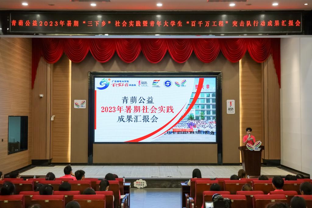 【本网讯】在2023年大学生暑期“三下乡”社会实践暨青年大学生“百千万工程”突击队行动中,学校青萌公益把课堂学习和乡村实践紧密结合起来,在乡村振兴中展现出青春力量,在实践中收获了成长。为更好的巩固社会实践活动成果,充分发挥先进典型示范带动作用,进一步引导学校广大青年学子积极参与社会实践,2023年10月28日上午,青萌公益在学校花都校区图书馆414报告厅召开了2023年暑期“三下乡”社会实践活动暨青年大学生“百千万工程”突击队行动成果汇报会。学校副校长易露霞、学校党办主任、青萌公益指导老师奚少敏、青萌公益各分队带队老师、青萌全体队员及学生代表等150余人参会,会议还采用线上直播的模式,吸引了3000余人在线观看。