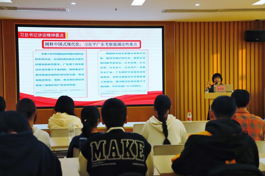 易露霞副校长带领学生回顾了习近平总书记自党的十八大以来四次考察广东的历程。她指出,从时间维度看,习近平总书记历次考察广东,都正值党和国家事业前进的重要节点,标注出新时代中国特色社会主义不断前进的历史进程,也为广东、为全国发展提供了明确指引、注入了强劲动力;从空间维度看,习近平总书记四次视察广东的步履遍及了珠三角和粤北粤东粤西,饱含着对广东不断推进高质量发展的殷切期望。随即,从抓紧做实粤港澳大湾区建设、打造具有全球影响力的产业科技创新中心、建设更具国际竞争力的现代化产业体系、下功夫解决区域发展不平衡问题,筑牢信仰之基、补足精神之钙、把稳思想之舵等方面对习近平总书记视察广东的重要讲话精神作深入解读。