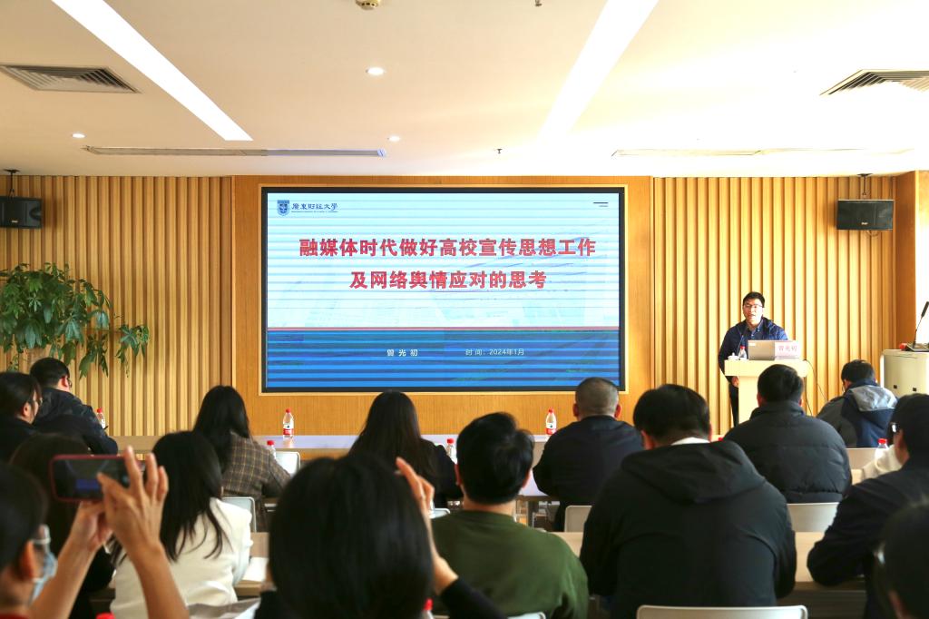 在经验分享会上,广东财经大学宣传部理论与思政科科长曾光初结合理论和具体案例,从习近平文化思想是做好融媒体时代高校宣传思想文化工作的指南、融媒体时代宣传思想工作面临的挑战、融媒体时代的高校舆情应对与引导三方面作经验分享,为参会人员如何处置学校突发事件,防范化解舆情危机,做好舆情应对与引导提供了宝贵的经验借鉴。