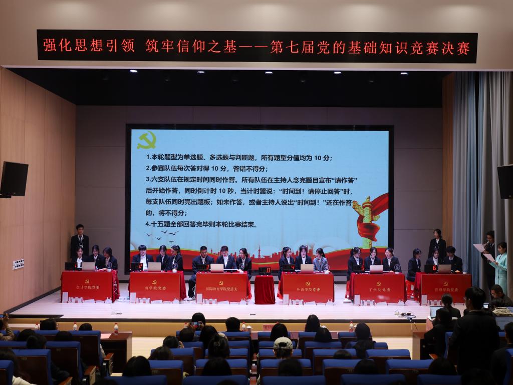 决赛共设置了必答题、抢答题、挑战赛、总决赛等四个环节。经过必答题、抢答题两种题型的比拼,前6支队伍进入1比1淘汰赛,展开最终对决。整场比赛精彩纷呈、扣人心弦,充分展现了参赛队员丰富的党的基础知识和强大的合作精神,精彩的对决赢得在场观众的阵阵掌声。经过激烈的角逐,管理学院代表队夺得了大赛的桂冠,商学院、国际教育学院获得二等奖,外语学院、工学院、会计学院获得三等奖,同时管理学院、商学院获得优秀组织奖。