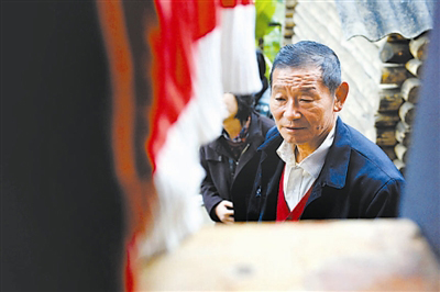 资料图片:2014年12月6日,高德荣在一户独龙族群众家门口等候了解情况。
