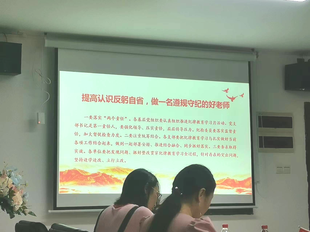 开展警示教育。纪律教育学习月活动开展以来,邢传国书记结合自身的管理工作经验,向大家讲述了教师教学过程中发生的各种违纪现象和后果,警示大家要廉洁自律,珍惜荣誉,守好底线,并组织全体党员教师观看了《教育部公开曝光的31起违反高校教师职业行为十项准则典型案例》,提醒党员教师要吸取深刻教训,保持清醒头脑,坚定政治方向。
