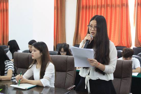 随后,学生代表相继发言,畅谈自己对书记胡春华“五四讲话”的认识、对参加学院“德学”、“五进”活动的收获,并结合自身实际,就如何在以后的学习工作中发挥团员青年的作用,争做有为青年展开了讨论。美术设计系黄小青同学说:“胡春华书记高度重视知识学习和实践锻炼,要求大家把学习和实践紧密结合起来,不断提高适应时代发展需要的素质和能力,其实与我院提倡的“五进”活动之“进社会”的目的是一样的,作为大学生应当积极践行社会实践活动,把学习和实践结合起来,以后参加工作,也要不断学习,坚持创新。”财金系的吴铭琪同学则认为:“新时代的五四青年人就要有担当、有责任。把中国梦、德学梦、青年梦结合起来,从小事做事,从身边做起,坚定理想信念、勇担青春使命。”