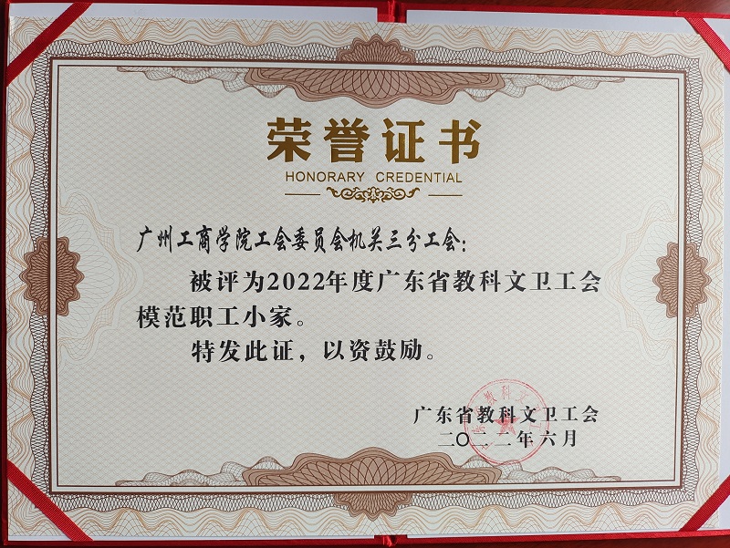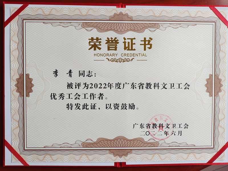 为表彰先进,树立典型,示范带动各级工会组织和工会干部进一步加强职工之家建设,夯实基层基础,省教科文卫工会于2022年3月份下发了通知开展“模范职工小家”和“优秀工会工作者”评选。近日,省教科文卫工会下发文件《广东省教科文卫工会关于授予模范职工之家、 模范职工小家、优秀工会工作者的决定》粤教工[2022]63 号文,beat365机关三分会和工会委员李青老师分别荣获广东省教科文卫工会授予的“模范职工小家”和“优秀工会工作者”称号。在广东省教科文卫工会第八届委员会第一次全体(扩大)会议上,学校工会常务副主席伍妙琼代表获奖集体和个人领奖。