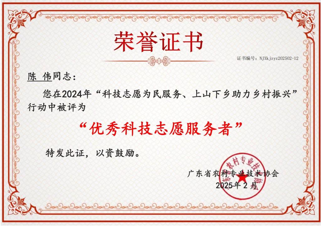 陈伟老师荣获“2024年广东省农技协优秀科技志愿服务者”称号