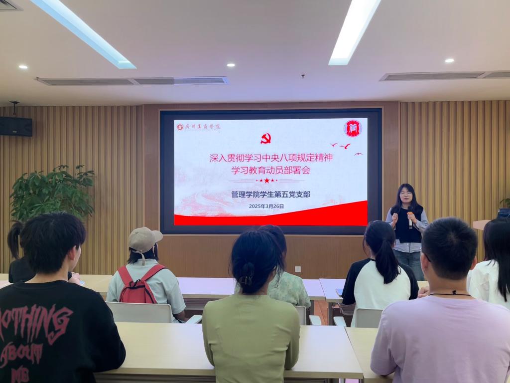【本网讯】2025年3月26日,管理学院学生第五党支部于图书馆6楼党员讲习所召开深入贯彻中央八项规定精神学习教育动员部署会。会议由谢丽星书记主持,支部全体党员参加。会议旨在通过学习中央八项规定精神,进一步强化党员的纪律意识和作风建设,确保全体党员在实际工作中严格遵守规定,以严明作风推动支部建设高质量发展。会上,谢丽星书记结合具体案例,对中央八项规定精神的核心要义进行了深入解读。她指出,八项规定不仅是改...
