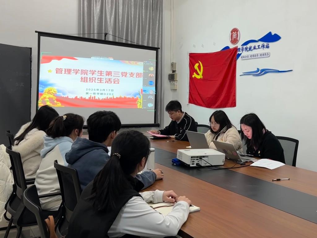 【本网讯】管理学院学生第三党支部于2025年3月17日在第一教学楼B202采用线上线下结合的方式召开了2024年度党支部组织生活会。本次会议由管理学院学生第三党支部组织委员冯佳同志主持,会议围绕习近平新时代勇于批评和自我批评精神、2024年党支部工作情况、每位党员根据自身实际情况进行批评与自我批评等主题展开,进一步提高党员的政治思想觉悟和能力,强化党员为党分忧、为党尽职、为民服务的政治担当。会议第一项议程,宣传委...