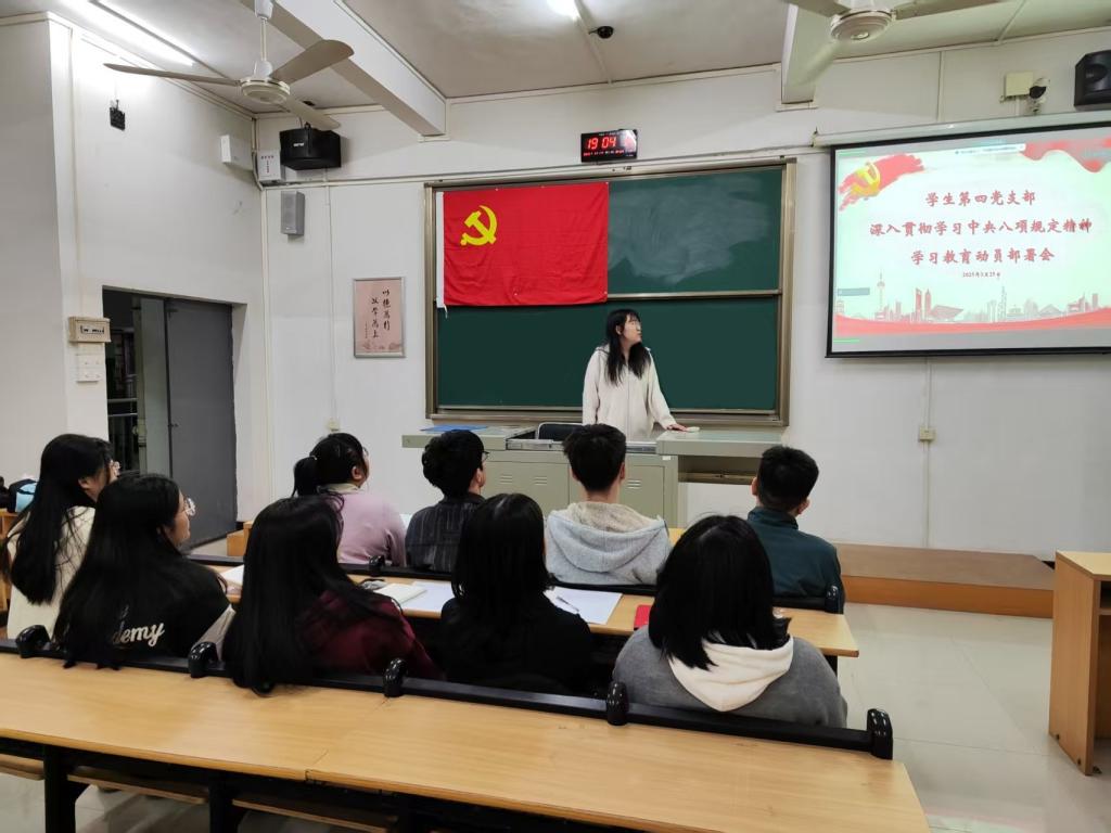 【本网讯】2025年3月25日,管理学院学生第四党支部在教学楼Ⅱ-D601教室开展了深入贯彻中央八项规定精神学习教育动员部署会。本次动员会旨在引导学生党员深刻领会中央八项规定精神的内涵,增强廉洁自律意识,推动作风建设常态化。学习会伊始,支部书记强调了中央八项规定的重要意义。自2012年12月4日中共中央政治局审议通过《中央政治局关于改进工作作风、密切联系群众的八项规定》以来,这一规定已成为全面从严治党、加强党风...