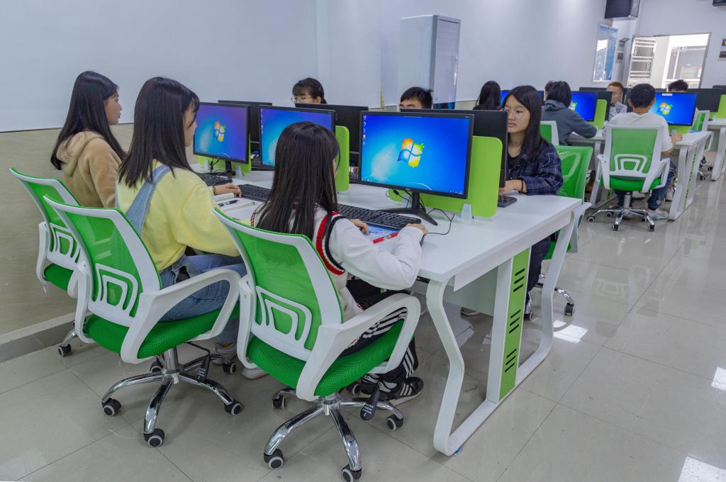 该实训室为智慧多屏综合实训室,主要承担的实训课程是《工商管理专业综合实训》以及其他的理实一体化课程,例如商务谈判与沟通,秘书实务、中小企业管理等课程的理论和实训教学。,周围是一个一个电脑工作区,主要是提供给学生收集信息、查阅资料用。理实一体化的课程均会涉及到信息的采集和分析,需要借助计算机来进行。中间是讨论区,采用自由拼接的活动桌椅设计,学生以组为单位参加小组学习和讨论。这种设计非常适合采用项目式和任务式的教学方法进行教学,而这两种方法也是工商管理类专业实训教学钟采用的最多的方法。