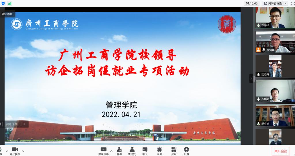 【本网讯】2022年4月21日上午9点,管理学院在院部楼612会议室启动“访企拓岗促就业”专项活动。由于疫情的影响,本次活动采用线上视频的方式进行。出席此次活动有学校董事办陆志丹主任、佛山米袋商务信息咨询有限公司事业一部负责人彭小林、渠道经理黄聪、管理学院院长乔鹏亮、管理学院副院长邹剑峰、管理学院办公室主任陈海松。