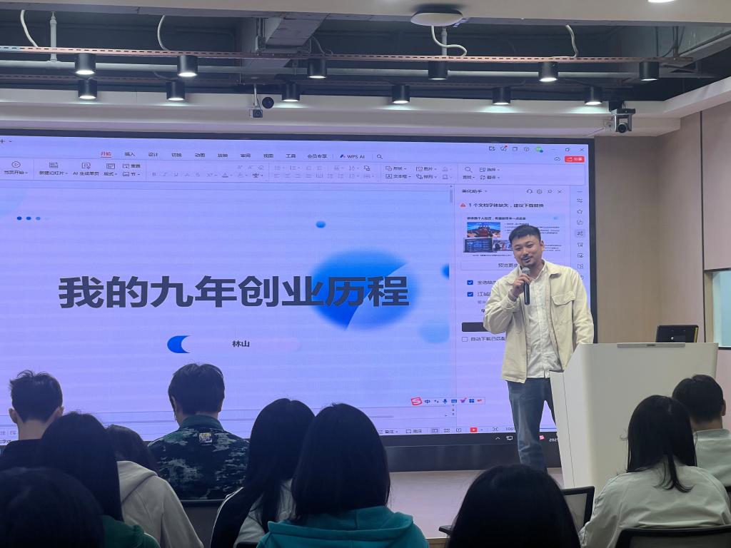 随后,公司副总经理林山作为主讲嘉宾,结合自身9年创业经历,带来了真挚又深刻的分享。林山于2016年毕业,其创业之路早在高三毕业时便已启程——当时他涉足手机与电脑销售领域,每台手机约100元的利润,成为他创业路上的第一桶金与宝贵起点。大学期间,他充分挖掘校园需求,以宿舍为临时仓库,开展二手教材销售业务,在摸索中积累商业运营经验与市场洞察力。毕业之际,他精准把握行业趋势,将毕业设计转化为可穿戴设备等新兴领域的产品,正式开启规模化创业征程。分享中,林山毫无保留地传授创业心得:“技术商业化绝非单一环节的成功,必须依靠产品、客户与销售渠道的全方位支撑,创业路上的每一次挑战,都是沉淀成长的重要契机。”