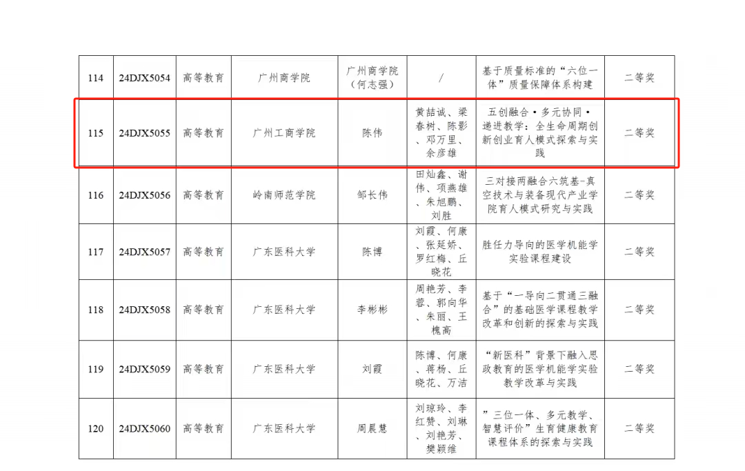【本网讯】近日,广东省教育评估协会发布《关于公布第五届教育科学研究与教育教学优秀成果奖获奖成果的通知》,管理学院陈伟团队申报的《五创融合·多元协同·递进教学:全生命周期创新创业育人模式探索与实践》荣获教育教学优秀成果奖二等奖。这是工商管理创新创业教学团队坚持以“学为中心、三全育人、产教融合、校企合作、崇尚创新”为中心,提升人才培养质量的教育教学改革成果。团队将以此为契机,继续为beat365深化教育改革和提升教学水平,培养高质量创新应用型人才而继续努力。