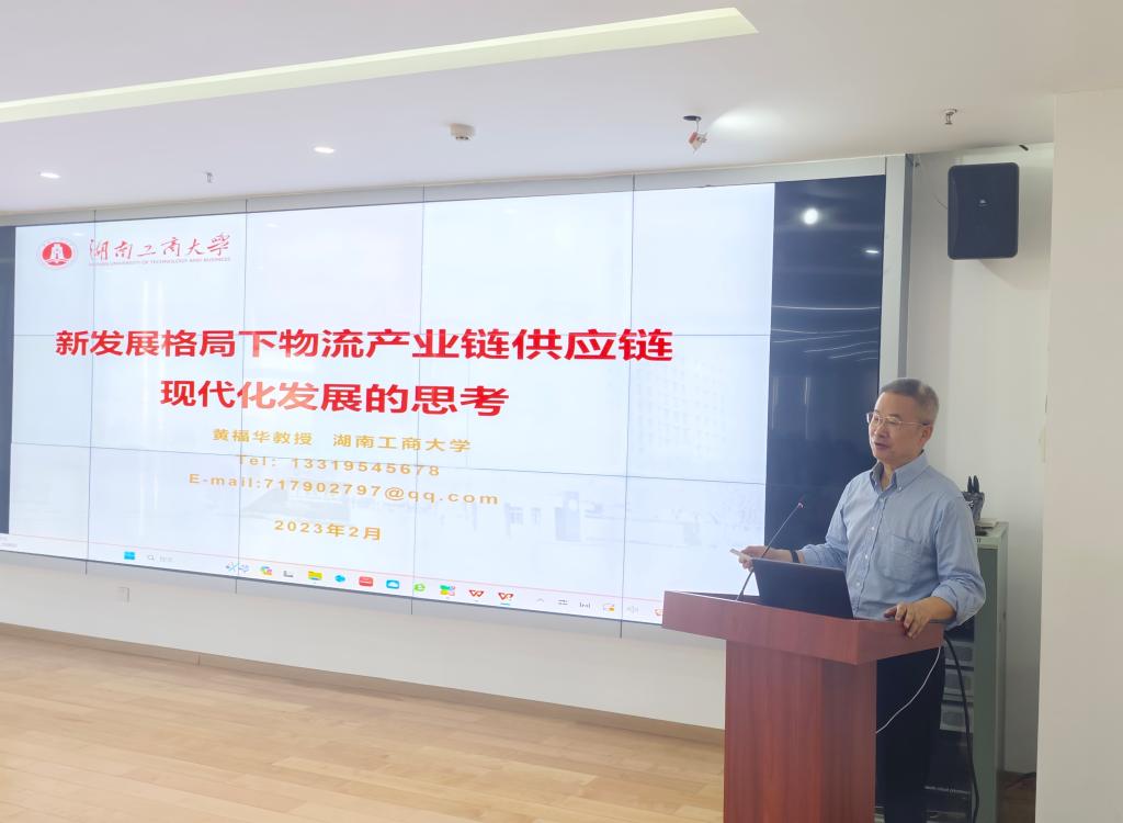 【本网讯】2024年5月14日,管理学院邀请了国家“万人计划”教学名师、国家教指委委员、湖南工商大学黄福华教授来beat365开展《我国物流供应链融入现代化产业体系的机制创新与模式优化研究》专题科研讲座,为我院教师传经送宝。科研讲座由管理学院院长乔鹏亮教授主持,邹剑峰副院长、管理学院专任教师和部分学生出席。