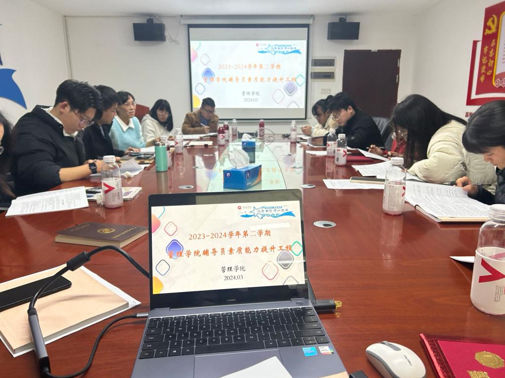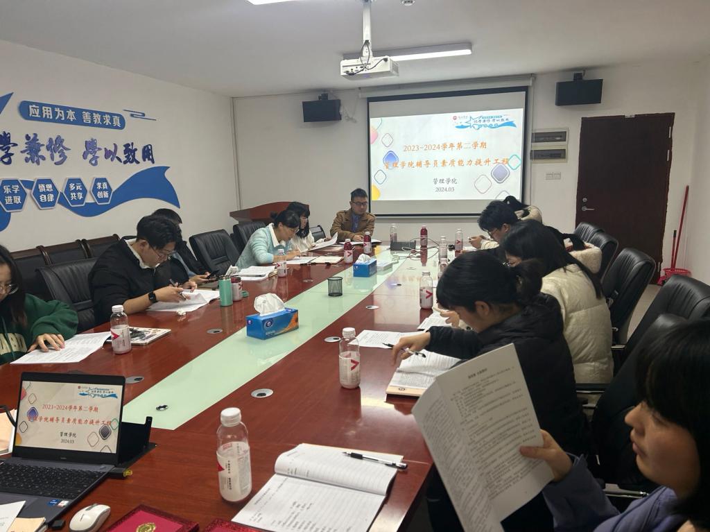 【本网讯】为加强学院学工队伍建设,进一步提升辅导员的业务能力、专业素养和履职能力,切实增强辅导员学生工作的规范化和专业化,2024年3月6日,管理学院在学校院部楼624会议室召开了本学期第一期辅导员素质能力提升工程研讨会,全体辅导员一同参会,会议由管理学院学工办副主任蒙宗玲老师主持召开。