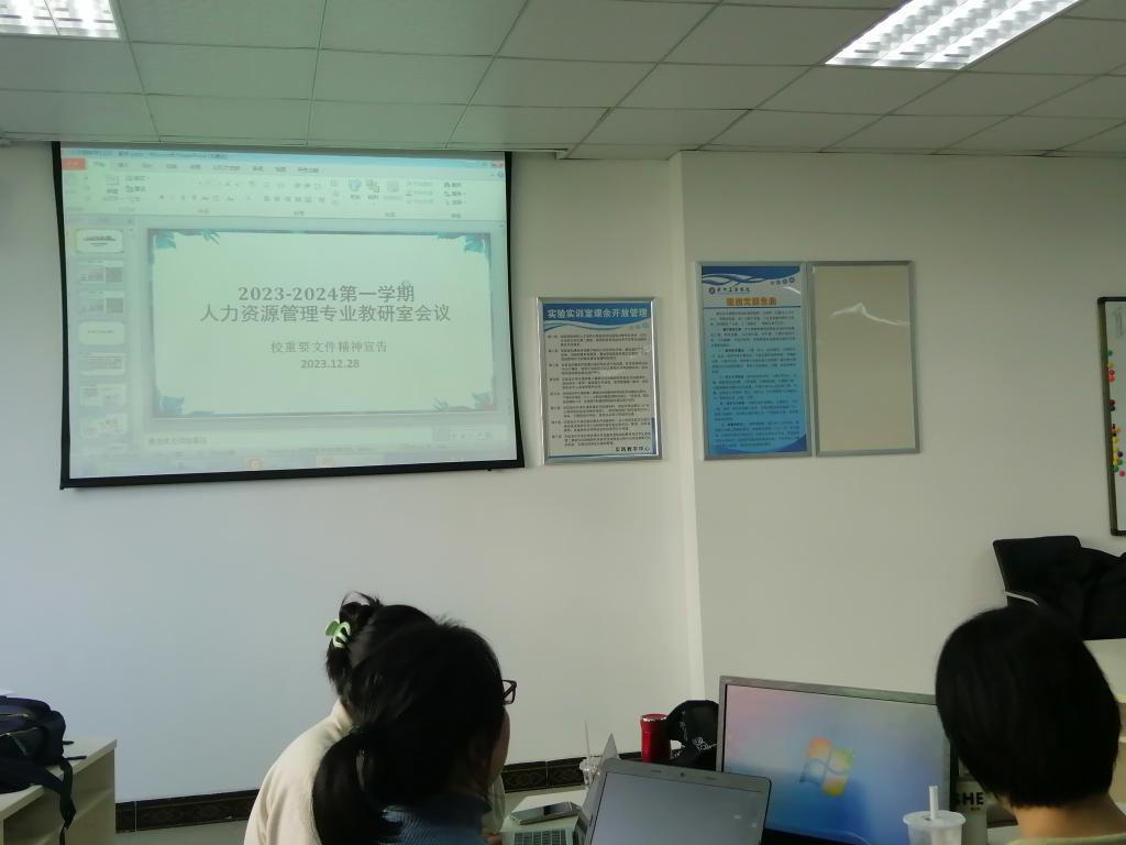 【本网讯】2023年12月28日,人力资源管理教研室就学校重要文件向本专业所有老师进行解读,传达文件精神,本次会议在第二实验楼A305教室召开,会议由王光辉主任、吴泽雄副主任主持,所有人力资源管理教研室、劳动关系教研室老师出席参加。