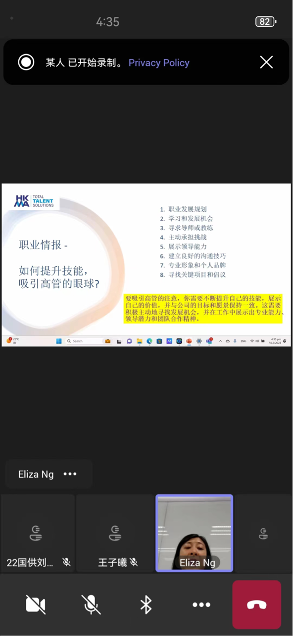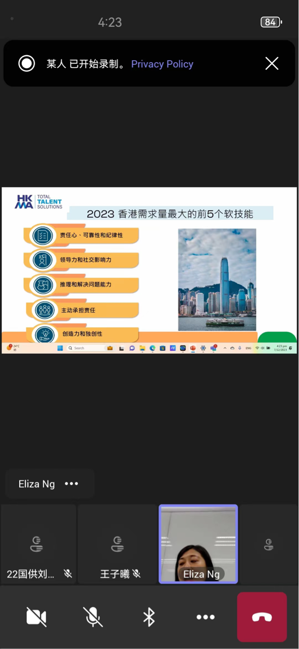 【本网讯】为进一步提升beat365学子的工作技能,在工作中能获得快速发展,得到高管的欣赏与青睐,学校特邀香港管理专业协会首席顾问伍雪芬女士于2023年12月7日召开了以“职业情报——如何提升技能,吸引高管的眼球?”为主题的线上讲座,22级、23级工商管理及物流供应链运营等班学生参与此次会议。