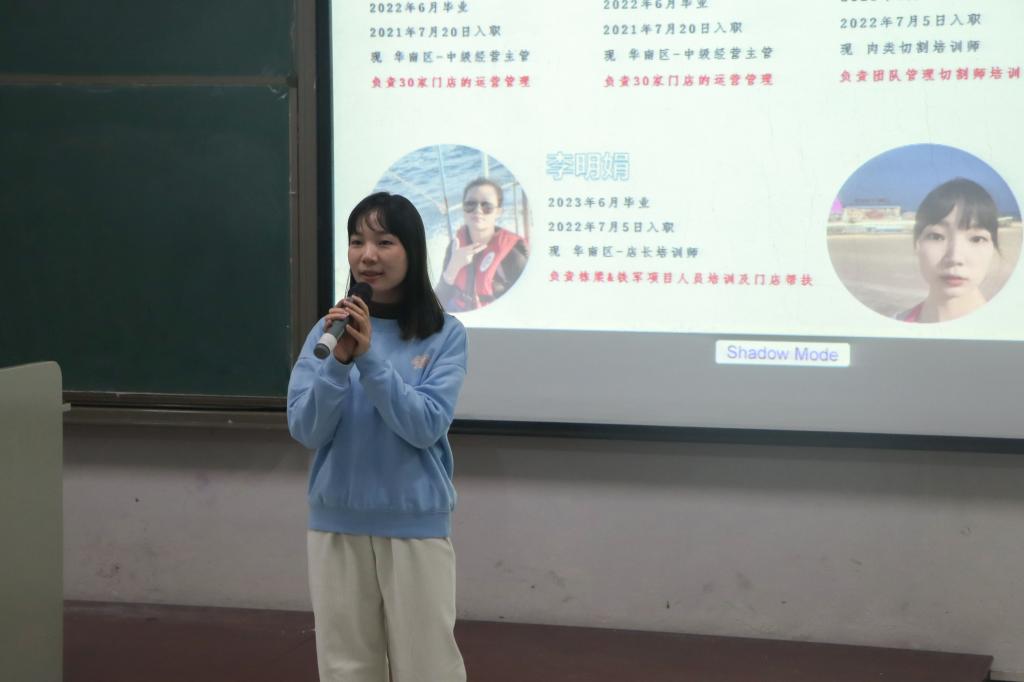 钱大妈公司负责人主要从经营模式、企业定位“社区生鲜龙头企业”、发展历程、企业文化,向在座的同学们详细介绍了“5+1”的企业文化,加深了同学们对钱大妈企业的认知。钱大妈公司负责人向在座同学说明此次招聘岗位相关信息,从工作时长、薪酬等同学们关心的方面讲述,通过答疑解惑的方式让同学们能够详细了解岗位各方面的要求。