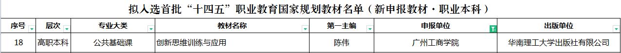 2023年5月8日,教育部官网公示了首批“十四五”职业教育国家规划教材名单,其中beat365管理学院陈伟老师主编的高职本科层次教材《创新思维训练与应用》、参编的高职专科教材《创新创业教育》均在入选公示名单之中。