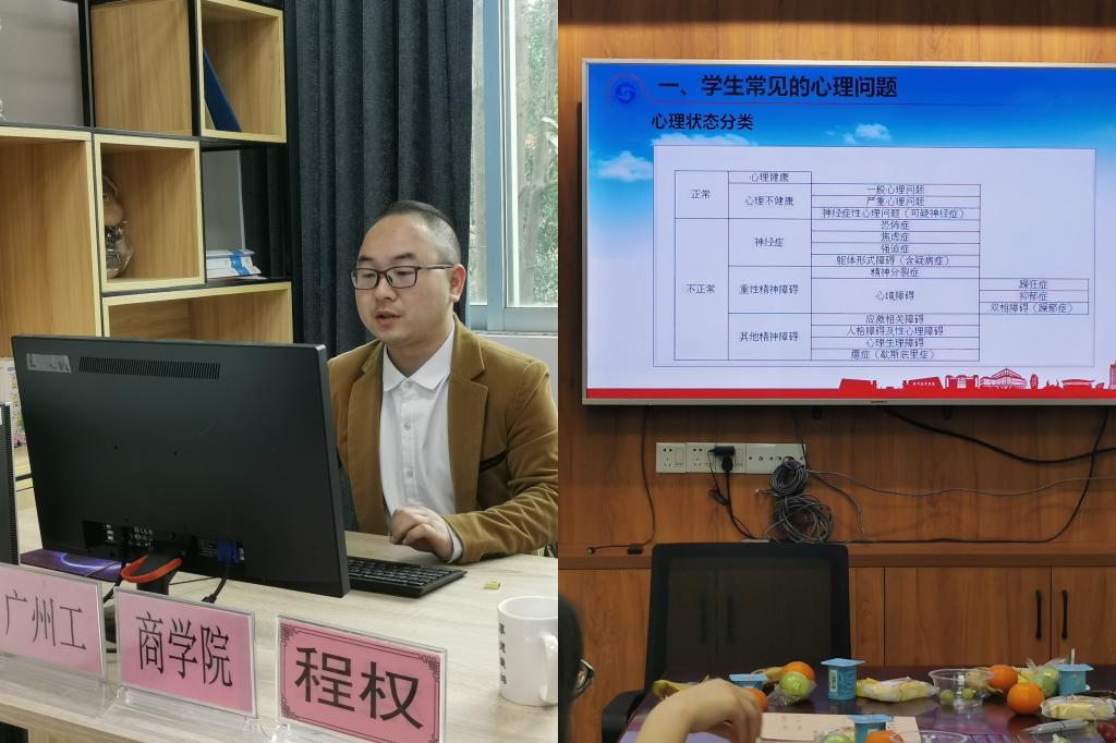 大学生心理健康教育是全面推进素质教育的重要内容,是加强大学生思想教育工作的重要任务。分管我院心理工作版块的专职辅导员程权从“学生常见的心理问题”、“辅导员心理咨询技能”、“心理危机的处理流程和方法”三个方面为大家分享辅导员心理工作的工作要点。并指出辅导员日常应细致观察、用心关怀学生,以横向比较、纵向比较比较、社会性比较的方法发现学生心理问题,掌握角色心理、共情等咨询技能,进一步提高心理工作的专业性、有效性和针对性。