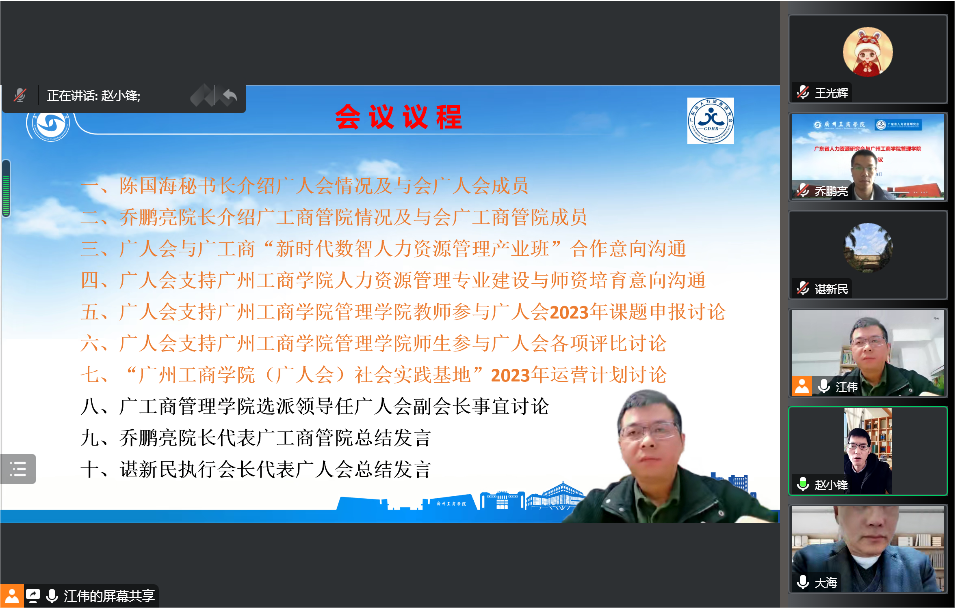 会议由广东省人力资源研究会副秘书长兼花都代表处秘书长江伟老师主持,管理学院乔鹏亮院长,梁春树副院长,邹剑峰副院长,赵小锋副院长,学院办公室陈海松主任,人力资源管理教研室王光辉主任,广东省人力资源研究会执行会长、华南师范大学经济与管理学院谌新民教授,广东省人力资源研究会常务副会长兼秘书长、广东外语外贸大学商学院陈国海教授,广东省人力资源研究会专职副秘书长兼办公室陈洁主任,办公室彭洁红副主任及会员部杨东燕副部长参加。