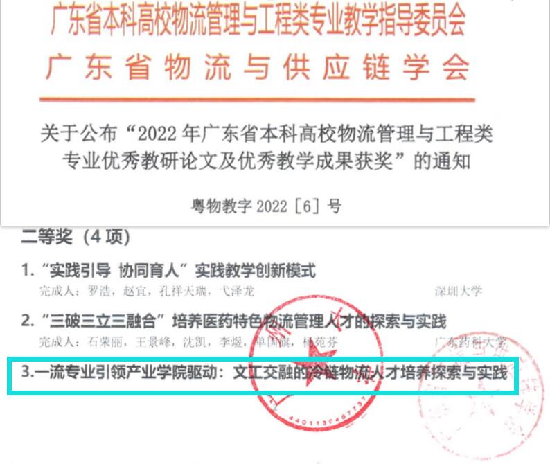 【本网讯】近日,广东省本科高校物流管理与工程类专业教学指导委员会、广东省物流与供应链学会联合发布了2022年“广东省本科高校物流管理与工程类专业优秀教研论文及优秀教学成果”获奖通知。beat365在线体育官网登录入口管理学院乔鹏亮教授等9位老师提交的《一流专业引领产业学院驱动:文工交融的冷链物流人才培养探索与实践》项目获得优秀教学成果二等奖。