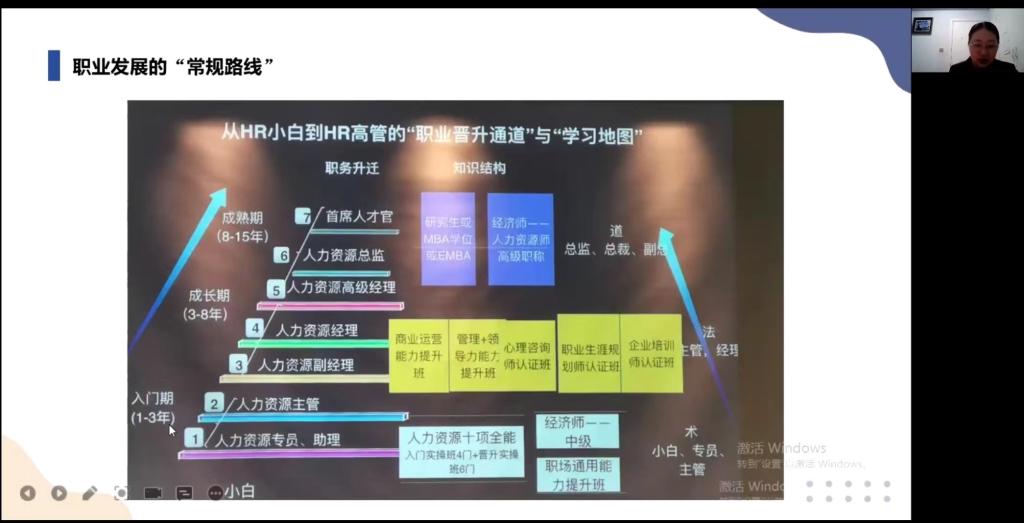 然后,廖茜老师主要围绕“人力资源相关岗位在当下的发展趋势和晋升路线”向同学们进行第二个模块的讲解。在讲解的过程中,廖茜老师结合人力资源的传统发展路线、职业发展的“三支柱模型”以及职业发展的“专家路线”这三个方面来帮助同学们进一步了解当前人力资源相关岗位的具体内容和职业发展路线。同时廖茜老师以自身的职业转型经历作为案例,向同学们进一步的强调:只要你能够足够的努力,其实永远都有机会回到最开始的那个战场;每个人都有无限的可能,永远都要去探索自己,发现自己喜欢什么、擅长什么,做好自己的职业生涯规划,掌控自己的人生。