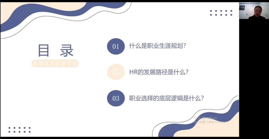 晚上7点,廖茜老师以“互联网人力资源沉浮”为主题给同学们上了一节职业生涯规划课,帮助对互联网行业或者人力资源相关岗位有兴趣的同学进一步了解具体岗位的职能和发展途径。廖茜老师主要是围绕“什么是职业生涯规划?HR的发展路径是什么?职业选择的底层逻辑是什么”这三个方面来向同学们进行讲解。其中廖茜老师结合自己十几年的职业生涯,重点向同学们讲述了关于HR的发展路径。同时,廖茜老师强调本次讲座的主要目的是:结合当前乌卡时代下拥有太多不确定性的背景,通过本次讲座能够帮助同学们基于自身规划和兴趣从容迈出职场“第一步”,拥有即将迈入职场的确定性和笃定感。
