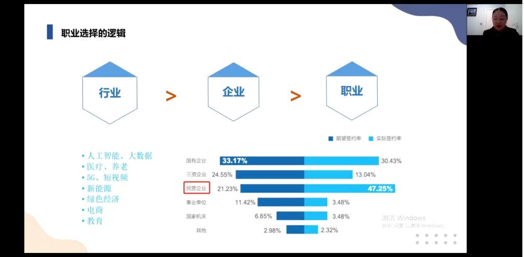 接下来,廖茜老师主要是以职业的本质、“行业>企业>职业”的职业选择逻辑、“热爱>素质>学历>经验”的就业竞争变化以及如何进入职场探索这四个方面来进行关于最后一个模块的讲解,帮助同学们能够更加深入的了解和学习职场的底层逻辑思维。并且以“热爱就是最大的职业,成长就是学会全面认识自己,全面接纳这个世界的过程。”这一观点结束本次讲座。