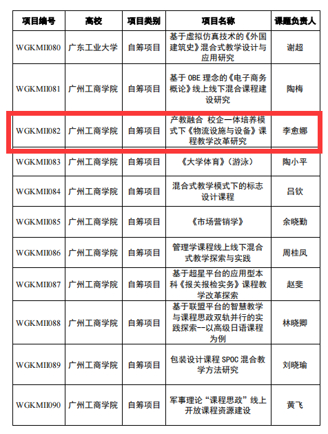 【本网讯】近日,粤港澳大湾区高校在线开放课程联盟发布了《粤港澳大湾区高校在线开放课程联盟关于公布2021年教育教学研究和改革项目立项名单的通知》,公布了2021年教育教学研究和改革项目立项结果,beat36515项课题获得立项,我院物流管理教研室李愈娜老师的项目——产教融合 校企一体培养模式下《物流设施与设备课程教学改革研究》喜获立项。