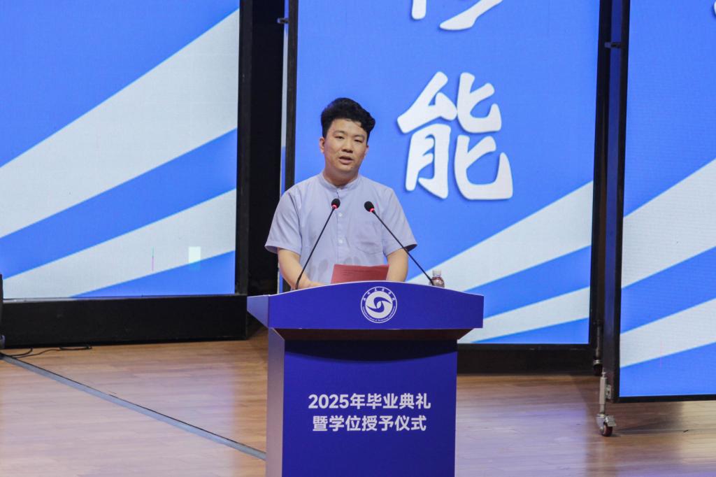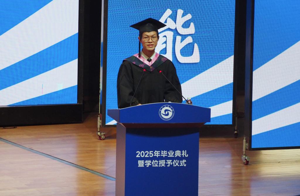 本届毕业生代表21级物流管理班的黄炜均在典礼上发表对毕业的感言和对同学们的祝福,也分享了自己在成长路上的感悟与心得:拥抱变化,培养动态适应力。夯实专业基础,深耕行业领域。连接赋能,构建成长共同体。