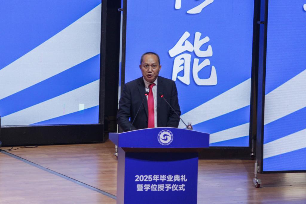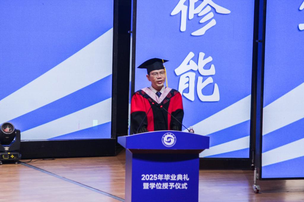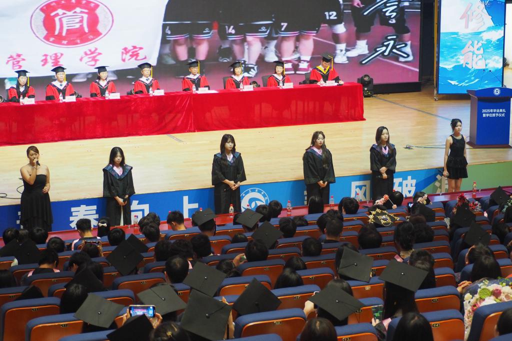 【本网讯】2025年6月21日下午,管理学院2025年毕业典礼暨学位授予仪式在三水校区院部楼千人影视厅隆重举行。管理学院党委书记、院长、学位评定分委员会主任委员乔鹏亮教授,副院长梁春树副教授,副院长邹剑峰教授,学位评定分委员会委员,专任教师代表、班主任代表、全体辅导员、教辅行政人员及2025年毕业生共同参加了这场热烈的毕业盛典。本次仪式由管理学院党委副书记赵小锋副院长主持。