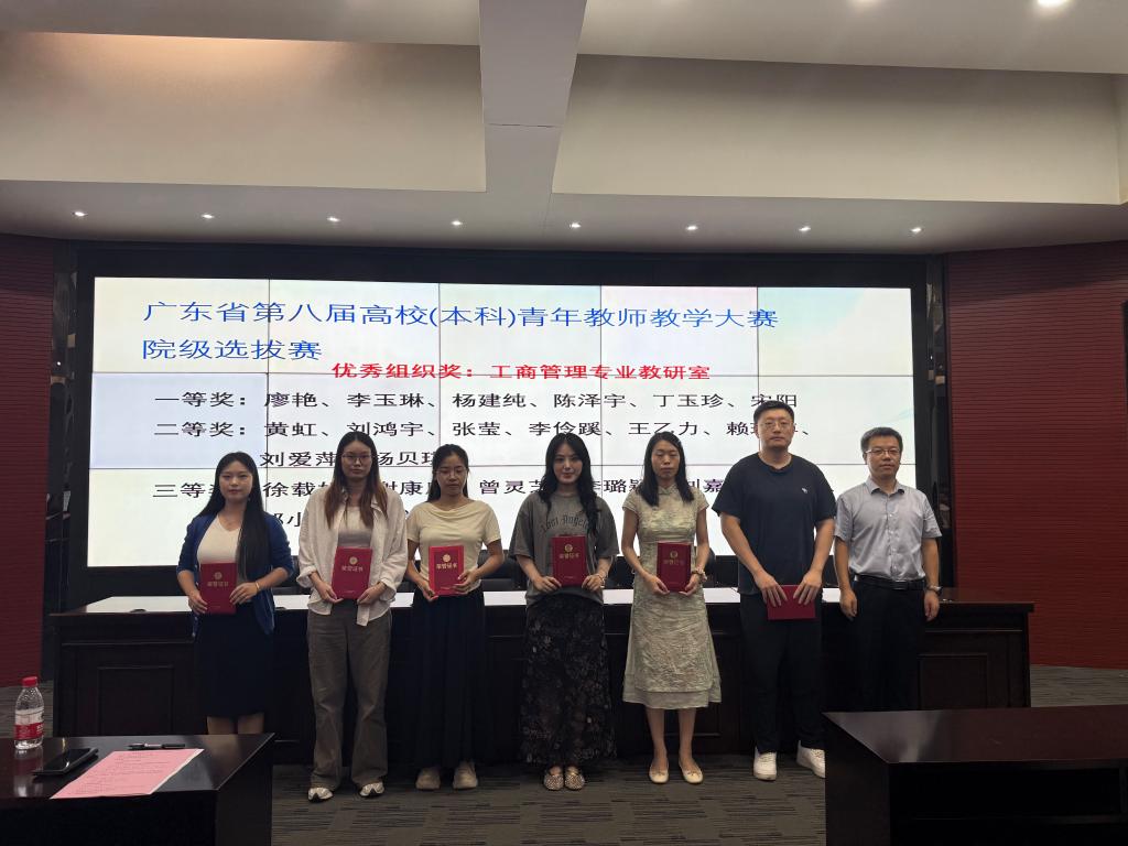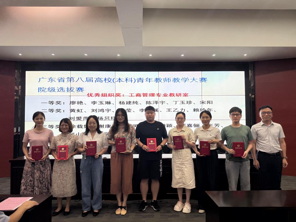 随后,大会进入表彰颁奖环节。首先颁发的是广东省第八届高校(本科)青年教师教学大赛院级选拔赛奖项。工商管理专业教研室凭借出色的组织能力,荣获优秀组织奖。一等奖获得者廖艳、李玉琳、杨建纯、陈泽宇、丁玉珍、宋阳老师,二等奖获得者黄虹、刘鸿宇、张莹等老师,以及三等奖获得者徐载娟、谢康康、曾灵芝等老师依次上台领奖。这些获奖教师在教学比赛中展现了扎实的专业知识和精湛的教学技巧,为学院赢得了荣誉。