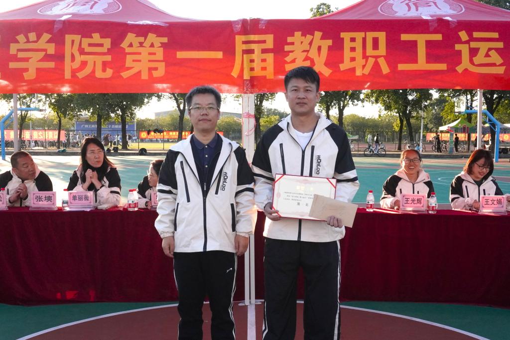 历经一个下午的激烈角逐,运动会圆满完成各项赛事,正式进入总分统计与颁奖环节。最终,本届赛会的魁首,是由大数据管理与应用教研室、学院办公室与学生工作办公室组成的联合队伍,他们凭借出色的团队协作与昂扬斗志,勇夺团体总分第一名。在热烈的掌声中,主持人依次宣布了各项目名次与团体总排名。学院党委书记、院长乔鹏亮,学院党委副书记、副院长赵小锋,学院副院长梁春树共同为获奖队伍颁奖,并同全体教师合影留念。镜头定格下灿烂的笑容,为本次体育盛会画上圆满句号。