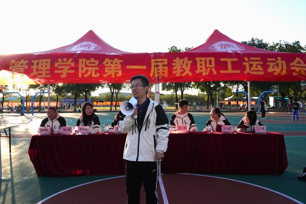 首先,由管理学院党委书记、院长乔鹏亮致开幕词,既表达了对运动会顺利举办的期待,也强调了运动健身与团队协作的重要意义。乔鹏亮院长在讲话中强调,体育锻炼不仅能强健体魄,更能缓解工作压力、改善心理状态。此次活动既是健身赛场,更是交流平台,鼓励老师们在运动中发现同事的闪光点,取长补短、增进情谊。
