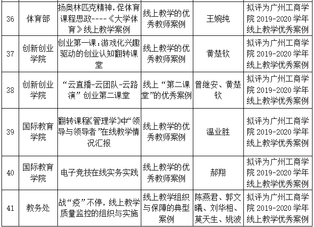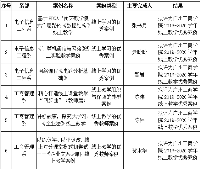 根据《关于征集疫情防控期间线上教学优秀案例的通知》的工作安排,经各单位提交材料、专家评审,经院长办公会审定,共评选出41项案例为“广州工商学院疫情防控期间线上教学优秀案例(第二期)”。现将评选结果予以公示(见附件)。