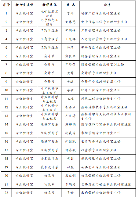 根据《关于做好2017年教研室主任期满考核及新一轮选聘工作的通知》(广工商院教发〔2019〕28号),学院近期开展了2019年新一轮教研室主任、副主任选聘工作。经各教学单位推荐、教务处形式审查、报院长办公会审定,拟同意聘用丁南等28位专业教研室主任、副主任,陈利萍等18位课程教研室主任(名单见附件),现予公示。