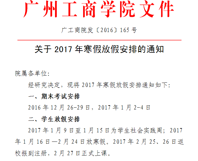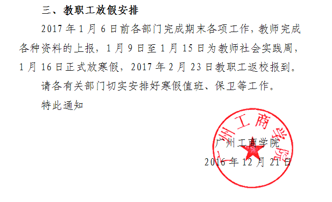 关于2017年寒假放假安排的通知