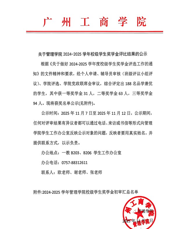 关于管理学院2024-2025学年校级奖学金评比结果的公示