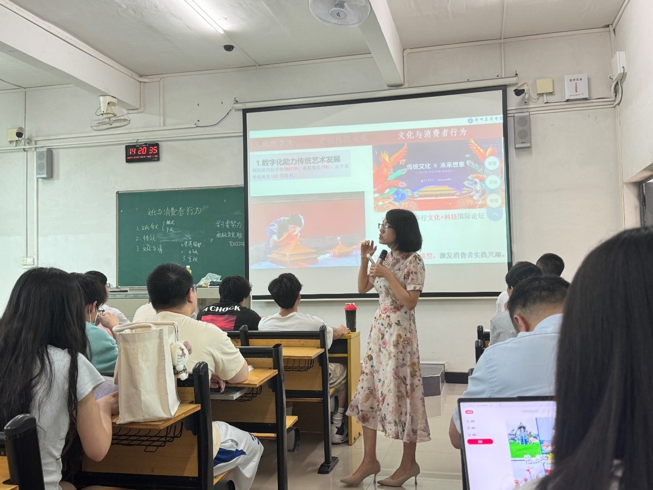 知识讲授环节是整堂课的高潮。刘爱萍老师首先讲解了文化的狭义和广义定义,并结合社会主义核心价值观的文化属性进行思政教育。接着,通过对中华传统文化的阐述和消费者实际行为的分析,深入探讨了文化对消费者行为的影响。此外,刘老师还介绍了推动传统文化发展的多种方式,如数字化技术的应用、文化IP与新媒体营销的结合等,这些内容不仅前沿而且实用,极大地提升了学生的学习兴趣。