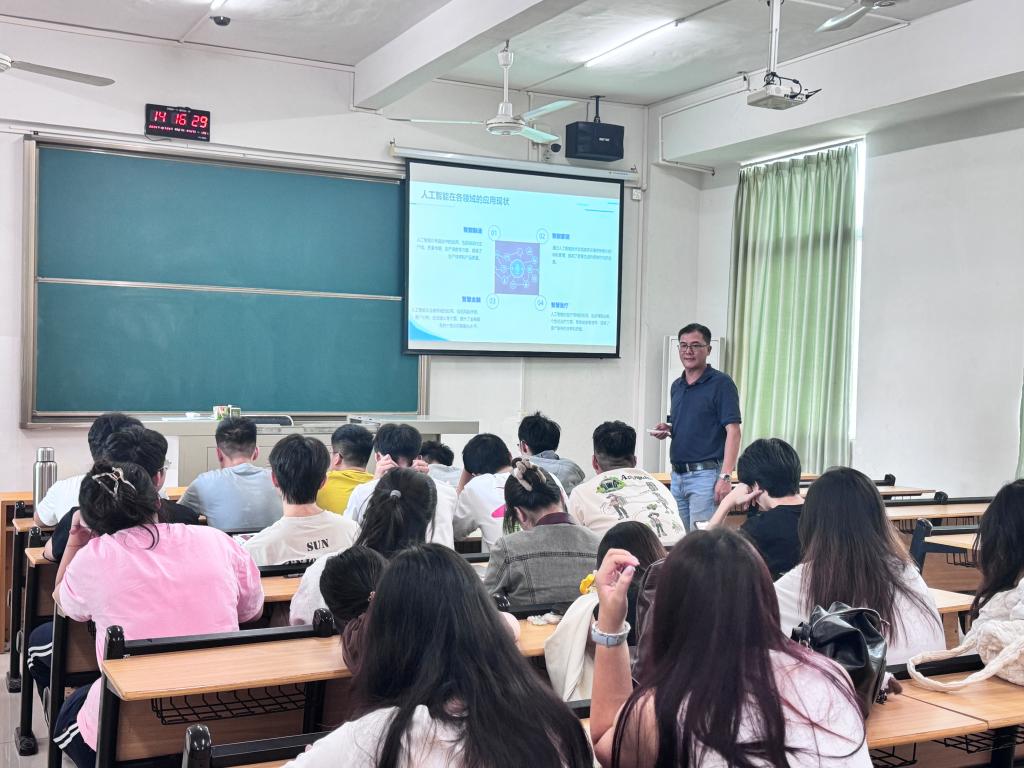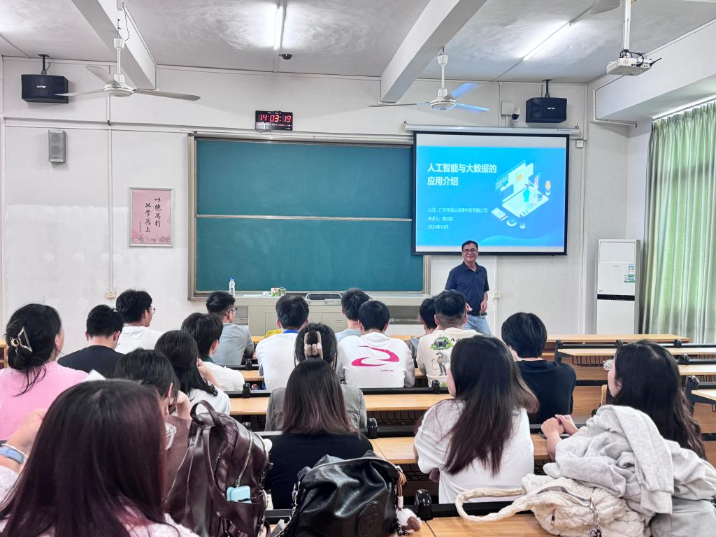 为了有针对性进行讲授,黄总首先调查了学生对“大数据”与“人工智能”这两个前沿科技概念的认知情况,了解了学生们当前的知识水平和学习需求,引导学生对这些领域的兴趣。黄总详细介绍了人工智能的基本概念、发展历程以及主要应用领域,介绍了大数据的定义、特点以及处理流程,并强调了数据收集、存储、分析和可视化等关键环节在数据驱动决策中的重要性。通过生动的讲授,学生们深刻感受到了大数据与人工智能的巨大潜力。