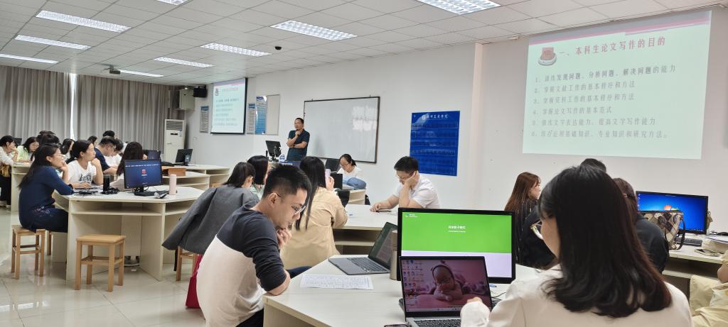 在本次培训会上,妥宏武副教授围绕五个方面的内容展开了详细说明。首先在本科生论文写作的目的中指到:毕业论文是训练学生发现问题、分析问题、解决问题的能力,掌握文献工作的基本程序和方法,同时掌握资料工作的基本程序和方法及掌握论文写作的基本范式;训练文字表达能力,提高文字写作能力;综合运用基础知识、专业知识和研究方法。所以老师对毕业论文的指导对培养学生的综合应用能力非常重要。