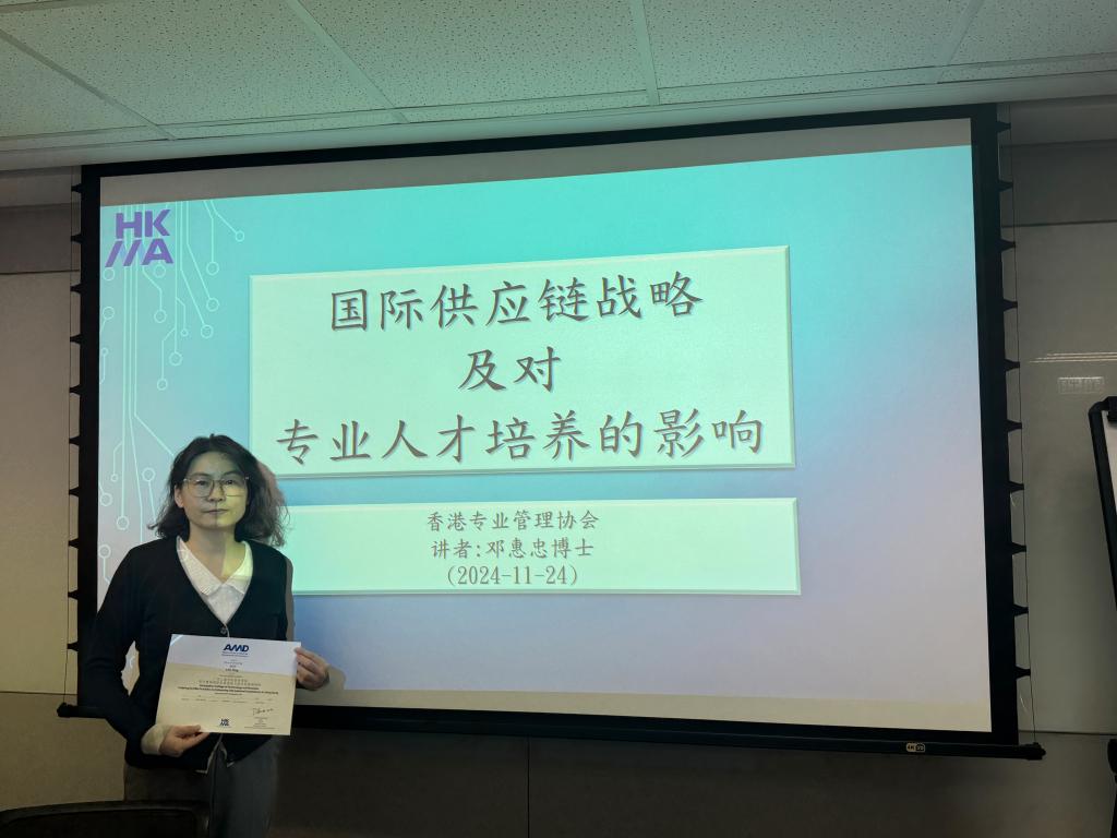 香港管理专业协会负责接待。本次研究活动有两场高质量主题讲座,分别是香港城市大学MBA及专业进修学院讲师蔡晓青博士的“供应链 / 物流管理大数据创新与应用”主题讲座,主要剖析大数据在供应链物流管理中的创新应用以及典型案例分析;香港专业管理协会邓惠忠博士作“供应链/物流管理国际供应链战略及对专业人才培养的影响”主题讲座,通过实例阐释国际供应链战略及人才培养要点,为课程教学提供了新思路。教师们与主讲人进行了热烈的研讨和交流。