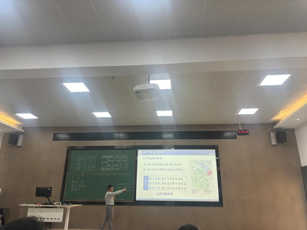 在课中讲授知识的过程中,章博士充分利用板书,清晰地列出了课程的逻辑思路。他的讲授内容具有很强的高阶性和挑战性,不仅涵盖了博弈论的基本理论和模型,还深入探讨了其在各个领域的应用。同时,章博士还加强了理论和实践的结合,通过推荐相关书籍和论文,拓展了学生的学习视野,激发了他们进一步探索博弈论的热情。