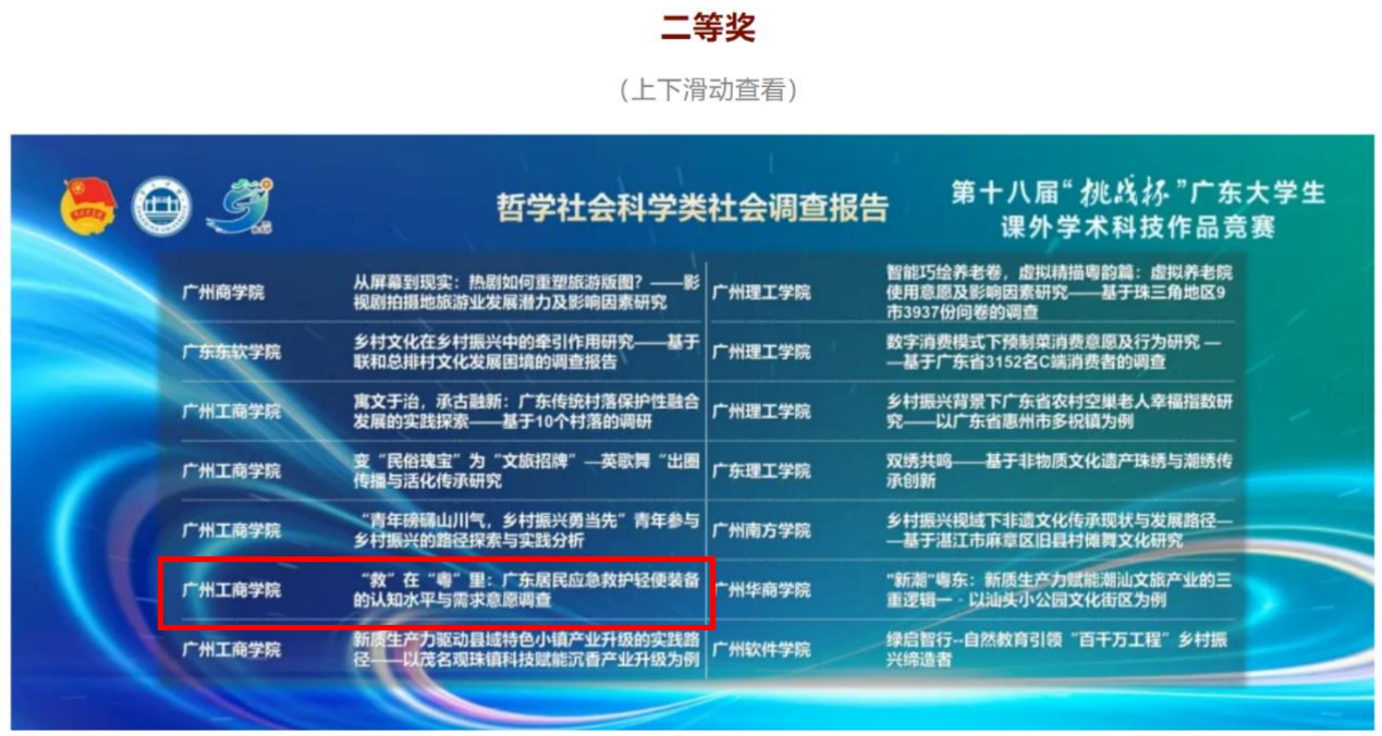 《商业计划书写作实训》是一门直接与大学生创新创业竞赛相关的课程。课程组除了认真完成课程教学任务之外,还大力辅导和支持学生参加各项竞赛活动,取得了良好的效果。课程组主讲教师邓万里、王保生指导的《“救”在“粤”里:广东居民对应急救护轻便装备的认识水平与需求意愿调查》项目,获得第十八届“挑战杯”广东大学生课外学术科技作品竞赛省级二等奖。