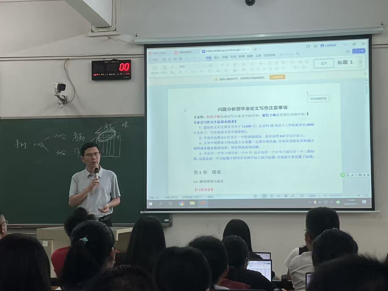 会议伊始,单主任强调了选题在毕业论文中的重要地位。她指出,选题必须严格符合教研室的规定,充分体现专业水平。会议的核心环节,侯治平教授围绕论文写作的关键要素展开了深入细致的指导。侯教授凭借丰富的教学经验和深厚的学术造诣,从论文题目的撰写、选题聚焦、实证基础、文献阅读与研究背景、行业问题与数据收集过程等多个方面,与老师们分享了宝贵的经验和实用的方法。在论文题目的撰写方面,他强调题目应简洁明了,准确反映论文的核心内容,吸引读者的注意力;对于选题聚焦,侯教授建议教师引导学生从自身兴趣和专业知识出发,选取具有研究价值且范围适中的课题,避免选题过于宽泛或狭窄;在实证基础方面,他指出实证研究是提升论文质量的重要手段,学生应掌握科学的研究方法,确保数据的真实性和可靠性;在文献阅读与研究背景方面,侯教授鼓励学生广泛查阅相关文献,了解前人的研究成果,从而找准自己的研究定位,为论文写作提供坚实的理论支撑。