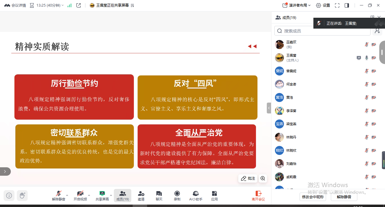 支部宣传委员王佩莹同志从什么是中央八项规定、中央八项规定精神实质、违反中央八项规定精神问题分类、相关党规党纪规定四个方面入手,进行了深入浅出的讲解。会议伊始,王佩莹同志详细阐述了中央八项规定的具体内容,让支部成员们对这些重要规定有了更为直观的认识。
