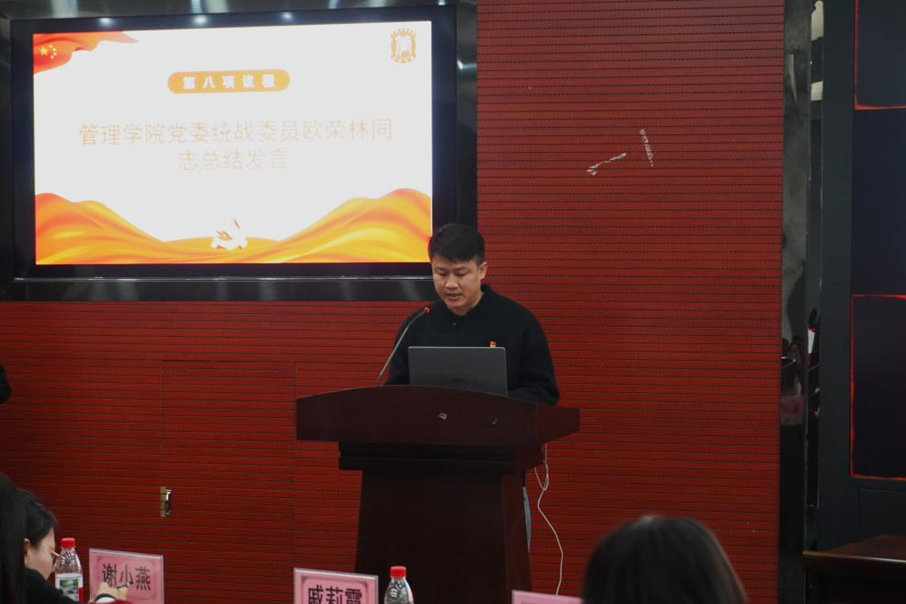 最后,由管理学院党委统战委员欧荣林同志为大会总结发言。他着重提出四点期望:一是要继续深化理论武装,筑牢思想根基,巩固学习成果并应用到实际。二是要对标党员标准,不断自我净化、完善、革新。三是要将个人理想融入国家发展与民族复兴伟业中去,发挥党员先锋模范作用。四是要端正入党动机、永葆赤诚,让结班成为砥砺前行的新动力。