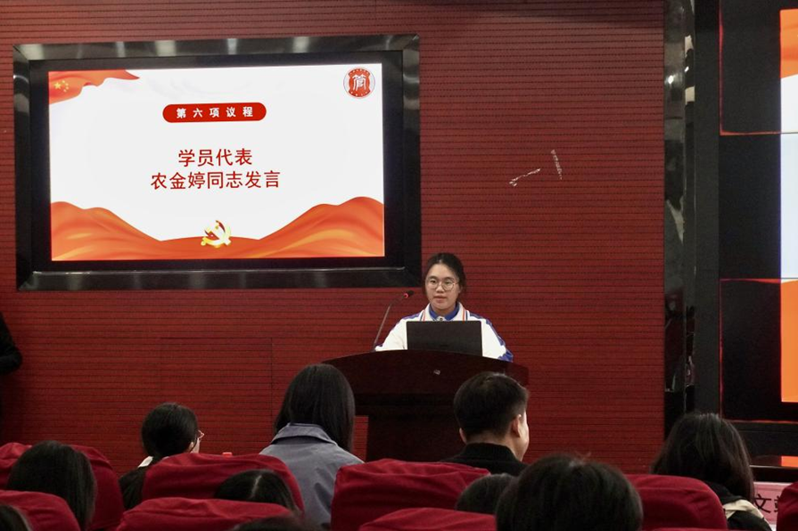随之展开的是学生代表农金婷同学的发言,她通过回顾向党组织靠拢的历程,深刻意识到成长之路需要以实干为基,持续在思想进步的道路上前行。农金婷同学强调,党员干部要在服务集体、助力学校发展与社会进步中,书写青年一代的担当与荣光。