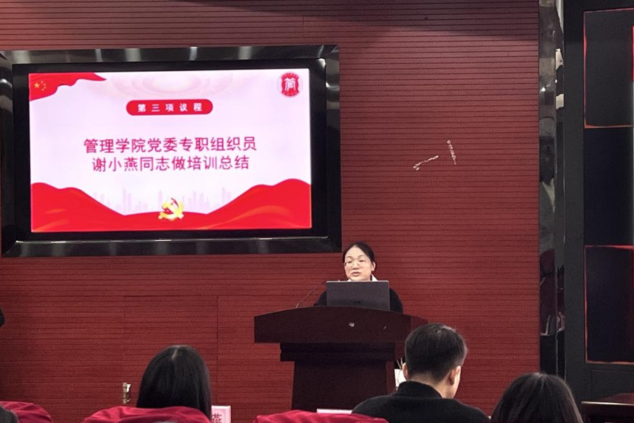 接着,由管理学院党委专职组织员谢小燕同志对本期党校培训工作做全面且深刻的总结。谢小燕同志回顾了本期党校培训班严格规范的选拔流程与多元化的培养方式,肯定了学员们在理论学习与实践锻炼中的成长。随后,她对学员提出三点期望:一是要坚定理想信念,筑牢思想根基,将在党校所学转化为实际行动;二是要勇担时代使命,展现青年的中坚力量;三是要传承红色基因,砥砺奋斗,有理想、有担当,为实现中华民族伟大复兴贡献青春力量。