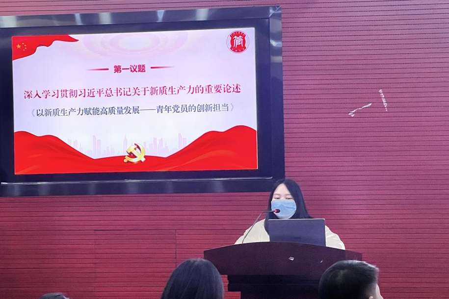 随后,由管理学院党委宣传委员张慧薇同志领学“第一议题”。张慧薇同志围绕深入学习贯彻习近平总书记关于新质生产力的重要论述展开深入讲解。她强调,党员干部要深入学习宣传贯彻党的二十届四中全会精神,广大青年干部要不断深化对新质生产力的理论认知和实践探索,做坚定的执行者、勇敢的开拓者和实干的践行者。